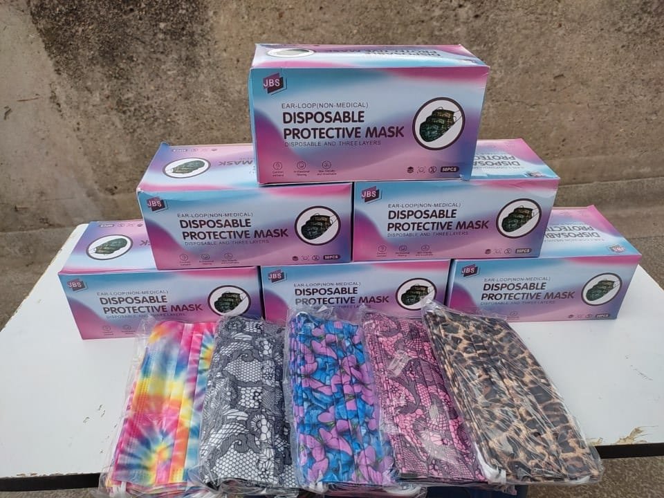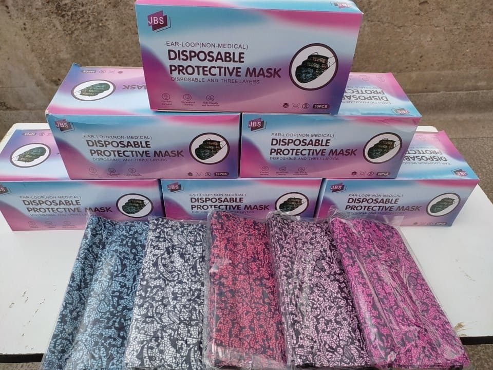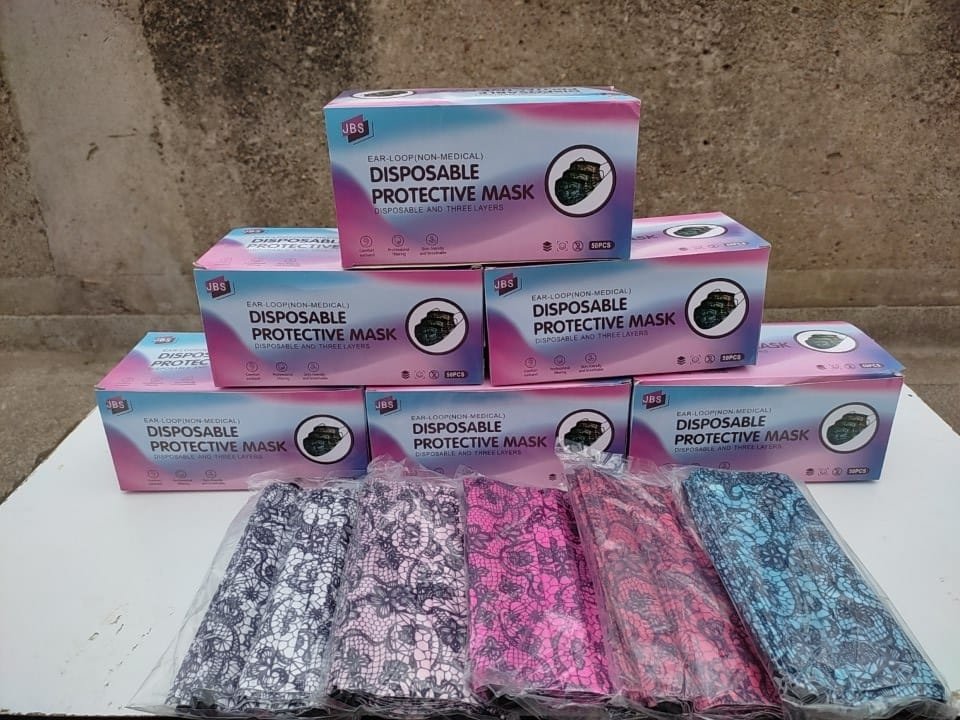 - You may be getting tired of wearing boring plain blue disposable masks. Our masks are all a black lace printed design over a white, blue, pink color background. Come in 3 different colors that can be perfect to match your everyday outfits. The clear and pretty lacery pattern will add bright spots and grace to wearing a face mask.