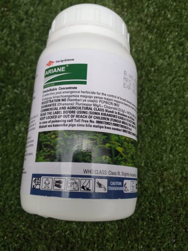 Ariane is a herbicide specially formulated for post-emergence control of a wide variety of broadleaf weeds in cereals – wheat, barley, oats, lawns, and turf. It contains Fluroxypyr+Clopyralid+MCPA as active ingredients.