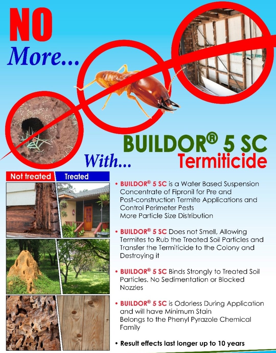 Buildor 5 SC – Antitermite is a termite control product that does not smell and not readily leached by the water. Protection on the area treated as per the label is more than TEN years. A termiticide for control of termites in houses and building constructions.