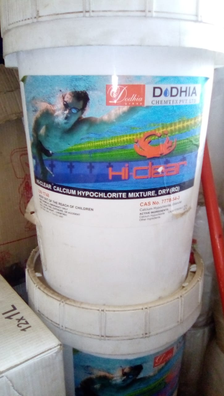 Granular Calcium Hypochlorite (chlorine dry HTH 65%) in a 45kg drum. Very high-quality stuff. Good for water treatment, disinfection(covid-19), bleaching agent, and pool chlorination.