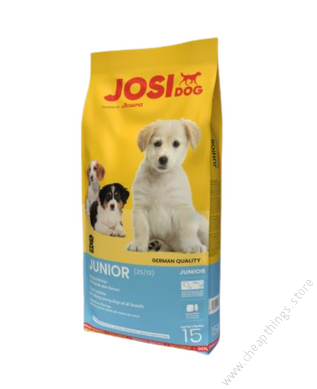 Product Details:Â Complete feed for growing dogs. A specifically adapted calcium/phosphorus ratio makes JosiDog Junior suitable for all young dogs from the age of eight weeks onwards up to adulthood. The gluten-free formula with adjusted energy content supports moderate growth rates and strong bones needed for puppies.