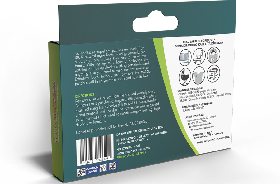 No MoZZies mosquito repellent patches are made from 100% natural ingredients including Citronella and Eucalyptus oils, making them entirely safe for you and your family. Offering up to 9 hours of protection, the patches can be applied to clothing, cots, strollers, furniture, and anything else you need to keep free from mosquitoes.