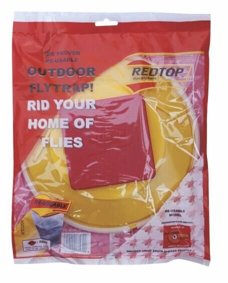 Redtop Standard Re-Usable (315 x 270 x 705mm) is a non-toxic, ready-to-use fly trap that catches common nuisance or filth flies, allowing them to enter through the yellow top cap and drown in the water, but not out. Re-Usable outdoor flycatcher with bait, bag, and hanging strap.
